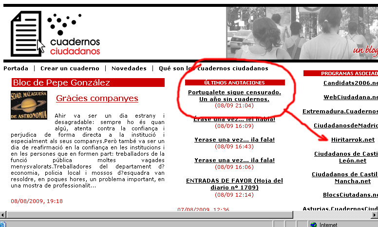 Ahora en agosto se cumple un año del comienzo de las obras de remodelación de los Cuadernos Ciudadanos de Anero. Parece ser que los trabajos han de ser importantes, porque un año de reformas para unos blogs han de suponer unos cambios espectaculares. Mientras tanto desde Portuberri os recomendamos que accedaís a vuestros blogs ciudadanos desde www.cuadernosciudadanos.net y publiqueís en el título (que es lo único que será visible) aquello que considereís para "meter caña" al censor.